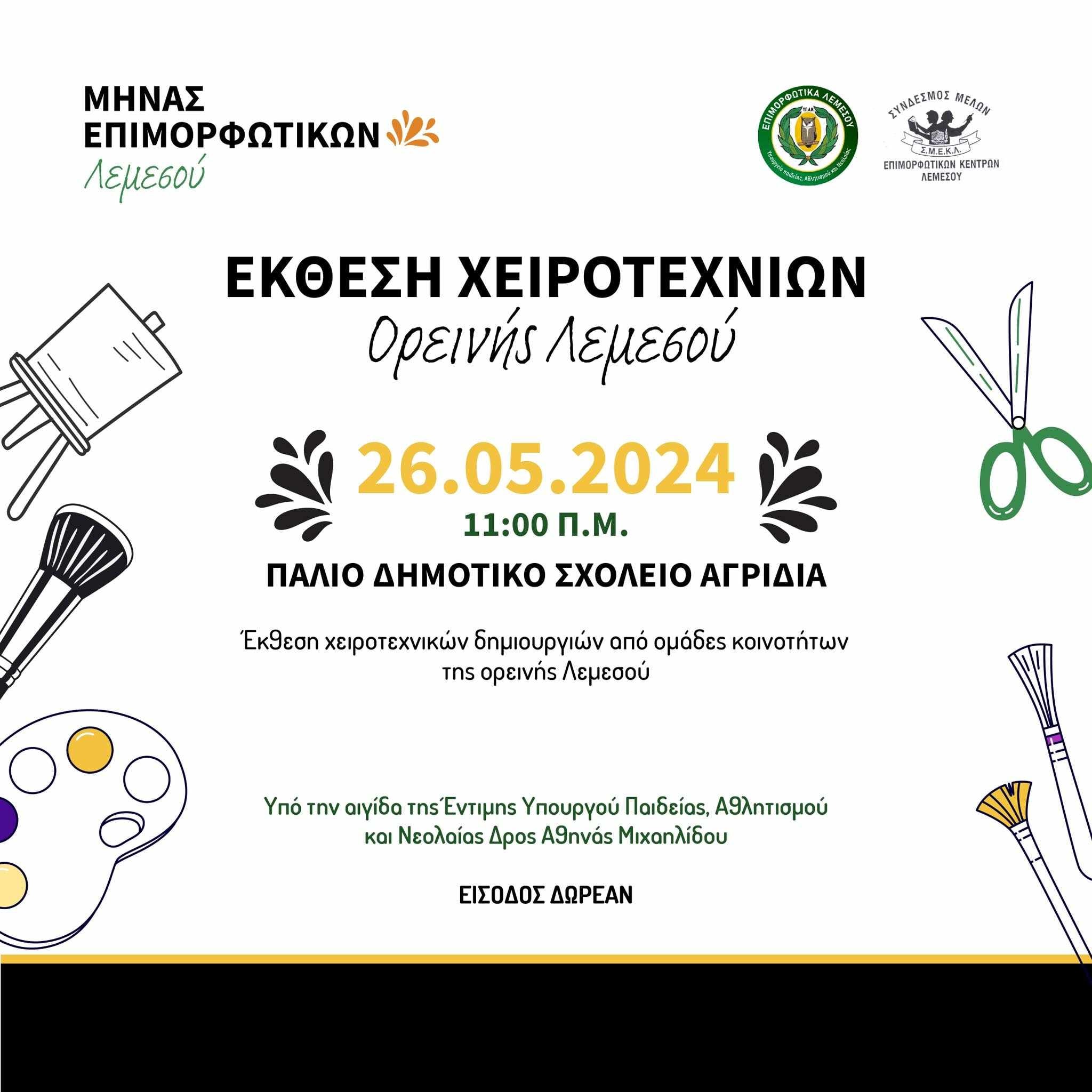 Τα Επιμορφωτικά Κέντρα Λεμεσού του Υπουργείου Παιδείας, Αθλητισμού και Νεολαίας και ο Σύνδεσμος Μελών των Επιμορφωτικών Κέντρων Λεμεσού, σας προσκαλούν στην Έκθεση Χειροτεχνιών Ορεινής Λεμεσού, που θα γίνει στα Αγρίδια, την Κυριακή 26 Μαΐου 2024 και ώρα 11, στον χώρο του Δημοτικού Σχολείου Αγριδιών.