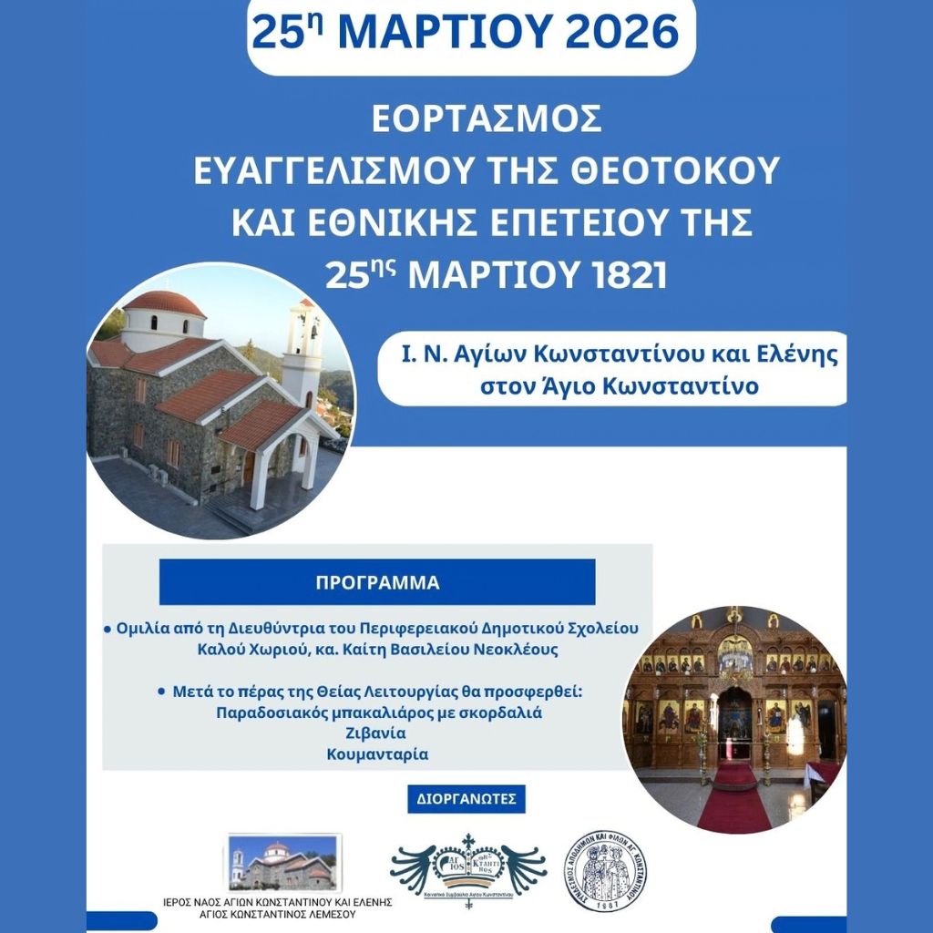 Ο Ιερός Ναός Αγίων Κωνσταντίνου και Ελένης διοργανώνει εκδήλωση για τον εορτασμό του Ευαγγελισμού της Θεοτόκου και της Εθνικής Επετείου της 25ης Μαρτίου στον Άγιο Κωνσταντίνο Λεμεσού