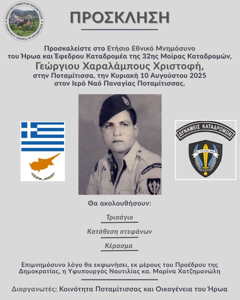 Η κοινότητα Ποταμίτισσας και η οικογένεια του Ήρωα, σας προσκαλούν στο Ετήσιο Εθνικό Μνημόσυνο του Ήρωα, Γεώργιου Χαραλάμπους Χριστοφή, που θα τελεστεί την Κυριακή 10 Αυγούστου 2025 στον Ιερό Ναό Παναγίας Ποταμίτισσας.