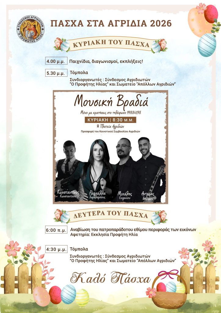 • 🤝 Διοργάνωση: Σύνδεσμος Αγριδιωτών «Ο Προφήτης Ηλίας» & Σωματείο «Απόλλων Αγριδίων» με τη στήριξη του Κοινοτικού Συμβουλίου Αγριδιών
