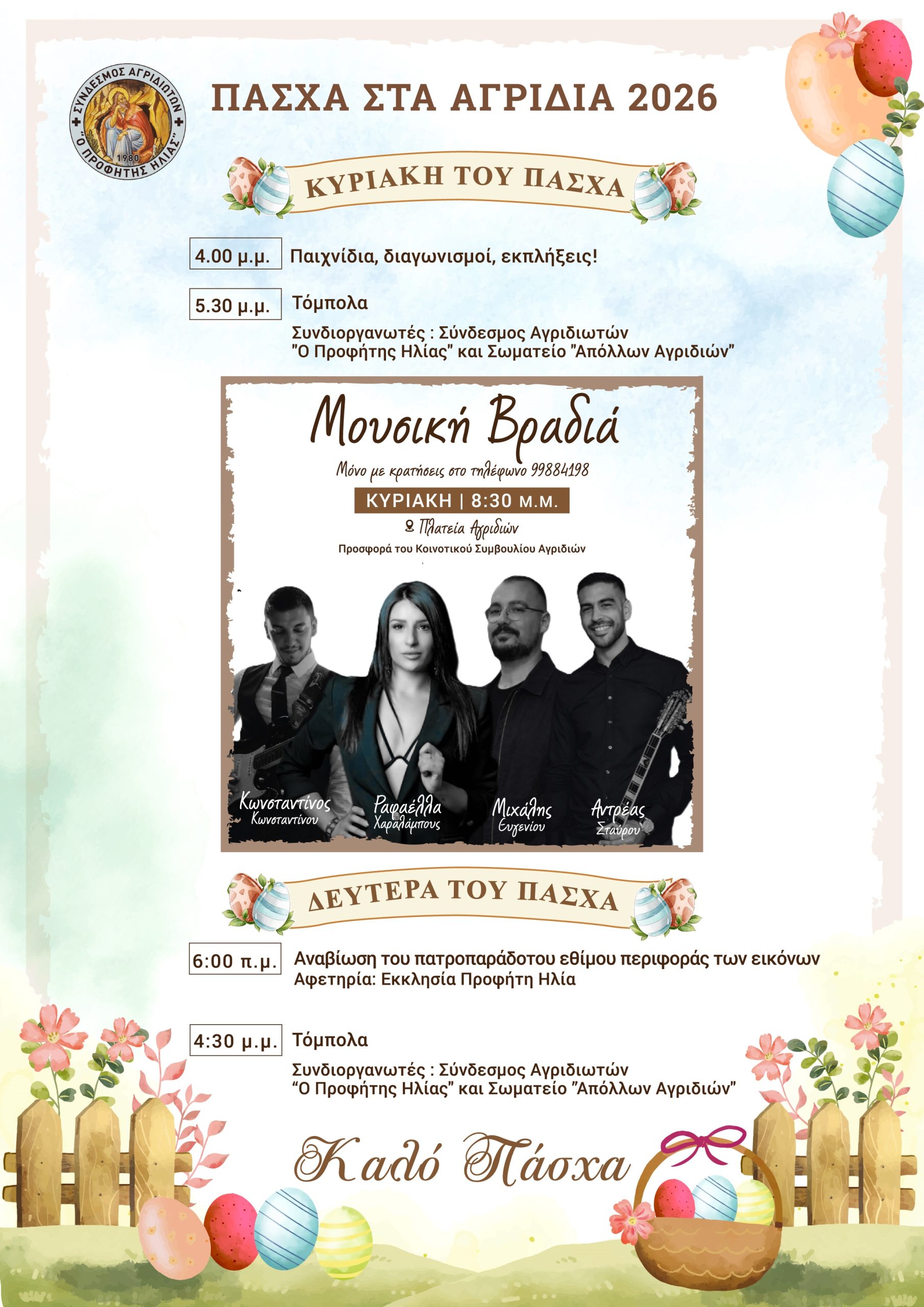 • 🤝 Διοργάνωση: Σύνδεσμος Αγριδιωτών «Ο Προφήτης Ηλίας» & Σωματείο «Απόλλων Αγριδίων» με τη στήριξη του Κοινοτικού Συμβουλίου Αγριδιών